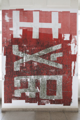 Isms contain different ideologies, belief systems and doctrines whose meanings are embattled and thus in constant state of flux. Here, the struggle for the meaning of whats (social-) ism actually is, becomes materially and physically tangible. The depicted piece of tarpaulin was originally part of a whole sentence - a populist slogan of the Communist Party of China. Torn in pieces, it was later used by a furniture salesmen to cover his commodities. The three remaining signs ISM are part of a history of ideas: Depending on who reads them, they either contain everything or nothing; they either tell stories or remain abstract white signs on a red background. Using a hand-held scanner, the tarpaulin found in Chongqing was scanned piece by piece and thus detached from its environment. Through the direct contact from the scanner to the material the ruinous surface was captured richt in detail - the traces, scratches and abrasions manifest not only of the decay of the material but also that of the ISM.