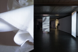 We are surrounded by three large format screens on which waves of folds of a white fabric are running towards a buzzing needle, resistant at times, yet only to be drawn back where they belong — between the shuttle and the feed-dog — by a hand that appears briefly within the frame. But what we do not instantly recognize is: The hand is the artist’s hand and the fabric is the fabric of the screen, on which its own hem is emerging with a clattering sound. Therefore, in Sewing Screens, as Olena Newkryta calls this three-piece work, “the relationship between the image and its material image carrier is directly linked: There is no video without a screen, and no screen without video,” as she says herself. Not only the material and the medium are interdependent, but also the spatial and temporal dimensions of the work depend directly on its visually and acoustically conveyed content: “The duration of the video results from the duration of the sewing process (15'40''). The size of the screens was determined by the proportions of the video (16:9) and the widths of the fabric. The videos […] show no action apart from the production process.” Gehrmann Lucas, Sternberg Press, 2017